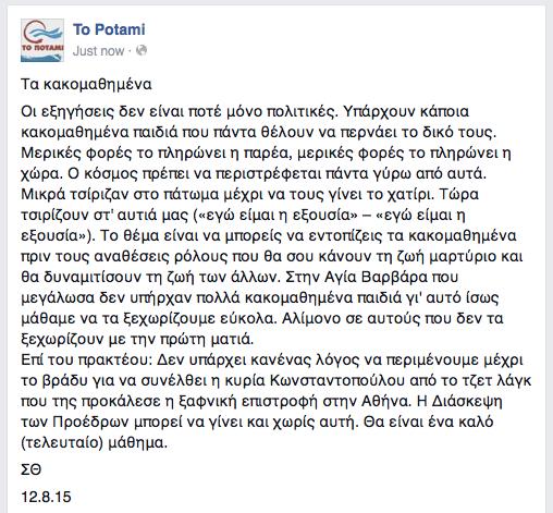 δημοσίευσε στον προσωπικό του λογαριασμό στο facebook, τις απόψεις του σχετικά με τα κακομαθημένα του ΣΥΡΙΖΑ.